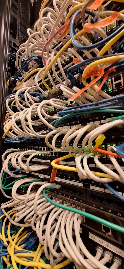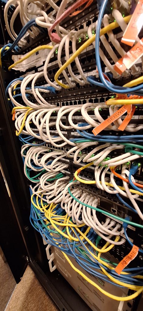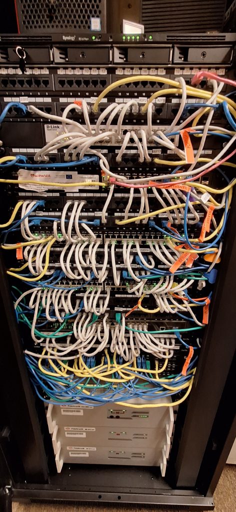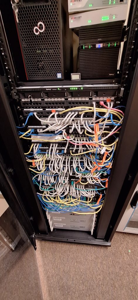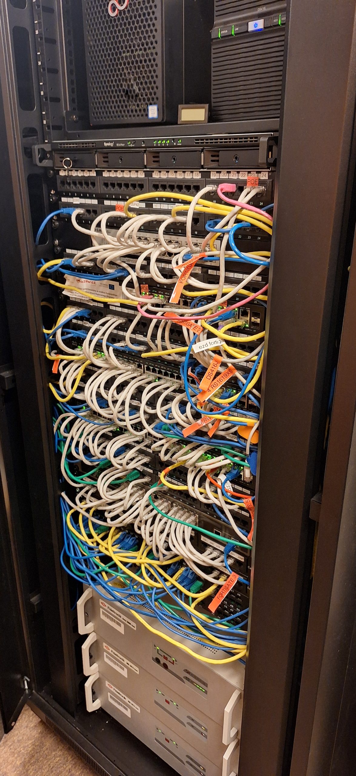 Oznaczono wszystkie poty, z oznaczeniem POE, gniazda telefoniczne przypisano do odpowiednich portów na switch`ach, użyto kolorowych przewodów w celu łatwiejszej identyfikacji podpiętych urządzeń. Przygotowano dokumentację papierową opisującą przebieg przewodów w tym przewodów z centrali telefonicznej. Przy okazji rozbudowano instalację o urządzenie Synology RS1619XS.