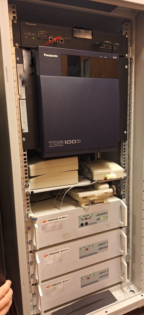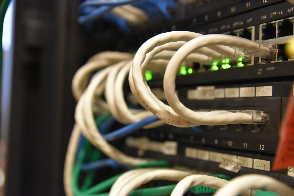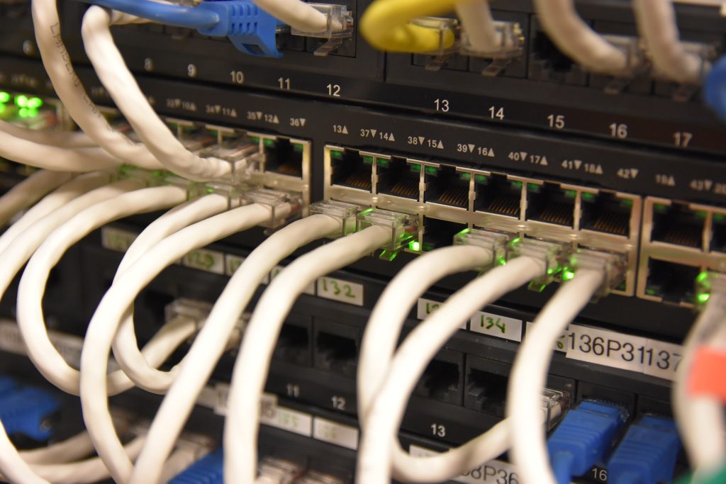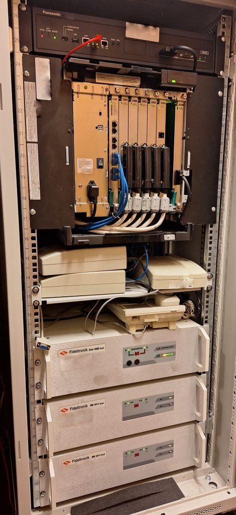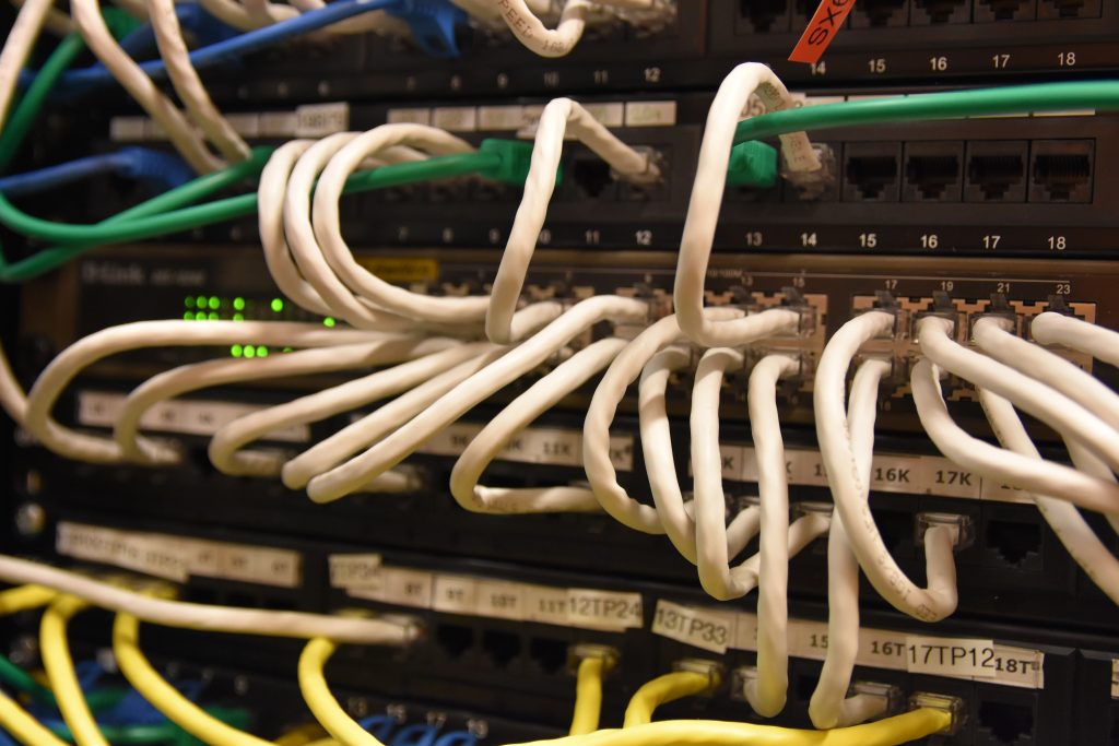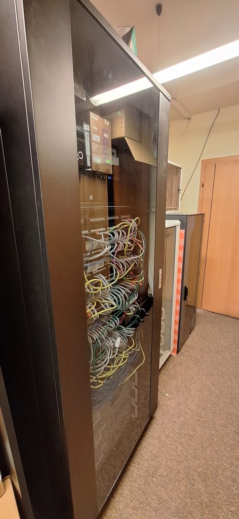 Oznaczono wszystkie poty, z oznaczeniem POE, gniazda telefoniczne przypisano do odpowiednich portów na switch`ach, użyto kolorowych przewodów w celu łatwiejszej identyfikacji podpiętych urządzeń. Przygotowano dokumentację papierową opisującą przebieg przewodów w tym przewodów z centrali telefonicznej. Przy okazji rozbudowano instalację o urządzenie Synology RS1619XS.